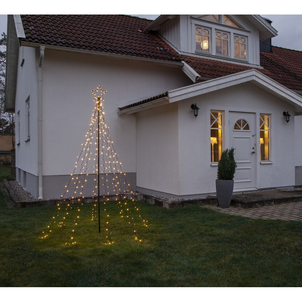 La struttura in metallo è solida e resistente, dotata di picchetti di fissaggio che assicurano stabilità anche in condizioni di vento, rendendo questo albero ideale per giardini, cortili e spazi all’aperto. Il grado di protezione IP44 garantisce una resistenza efficace agli agenti atmosferici, permettendo di utilizzare l’albero senza preoccupazioni per tutta la stagione natalizia. Con il suo effetto a cascata, le luci creano una cornice luminosa e scenografica che incanta grandi e piccini.