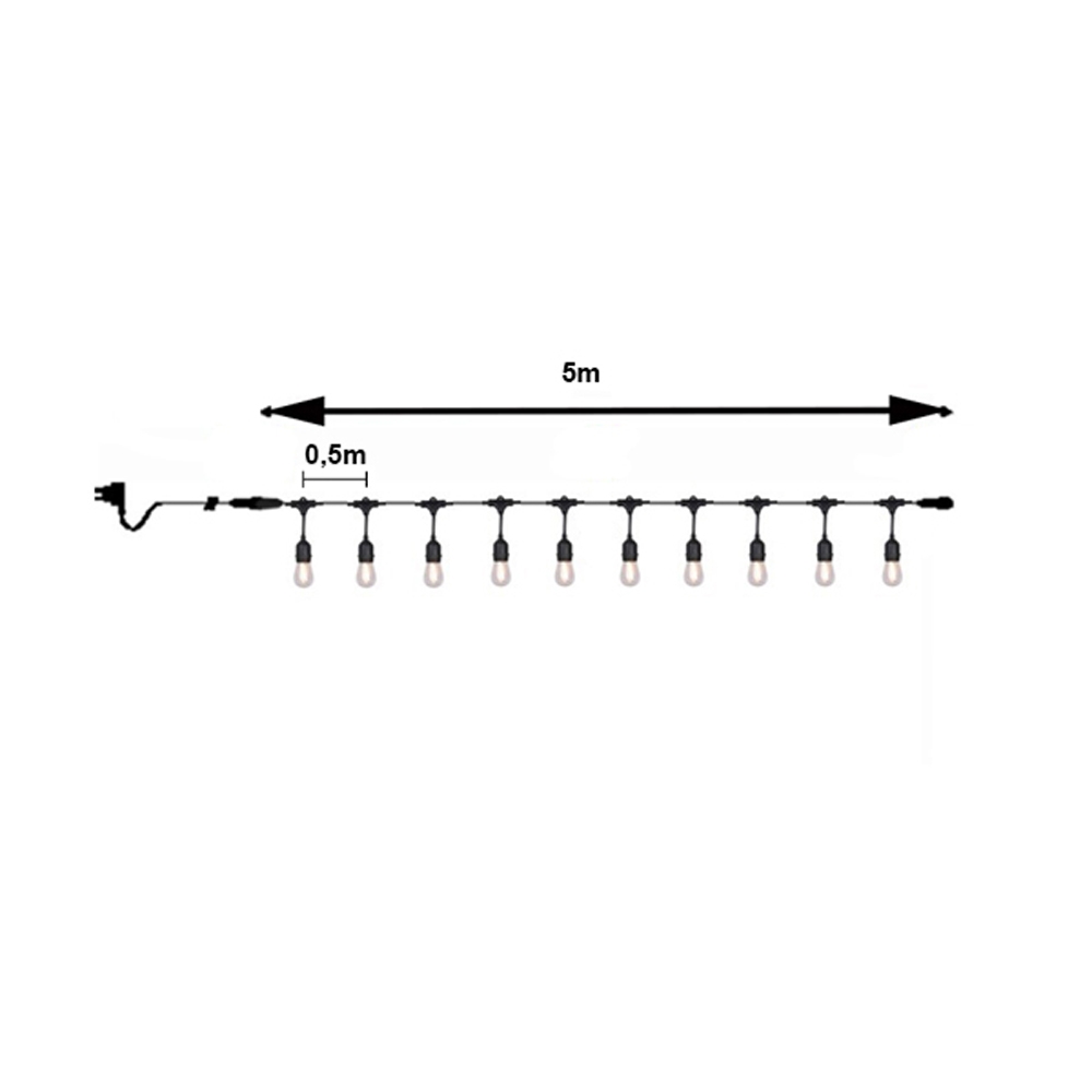 La catenaria si alimenta tramite la rete elettrica e ha una lunghezza di 5 metri, le lampadine sono posizionate a 50 centrimetri di distanza l’una dall’altra. Inoltre, alle due estremità sono dotate di due connettori a tenuta stagna che permettono di collegarle tra loro e raggiungere la dimensione desiderata.Lo stile, chiaramente, varia in base alle lampadine installate.