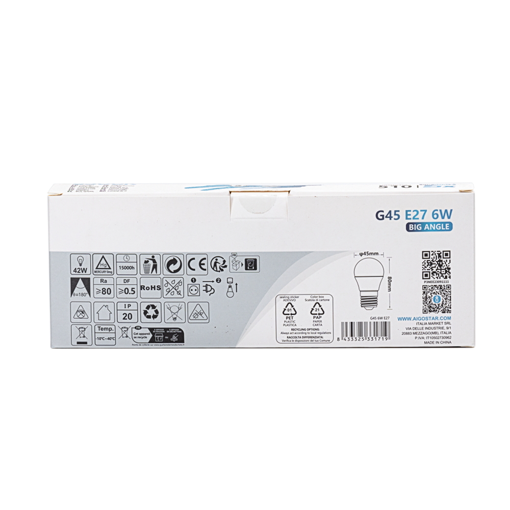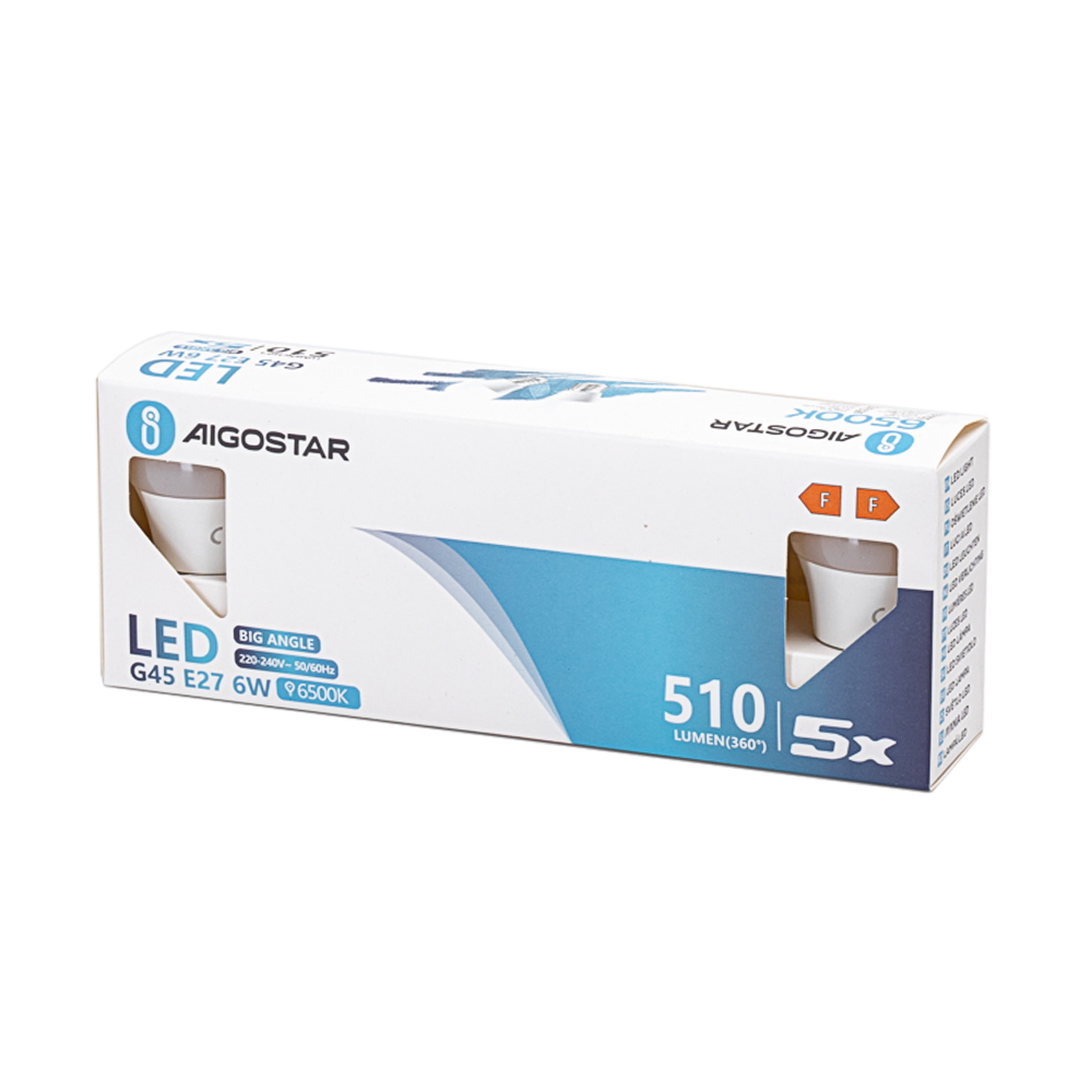 Confezione da 5 Lampadina Led E27 G45 6W Bianco freddo 6500K Aigostar