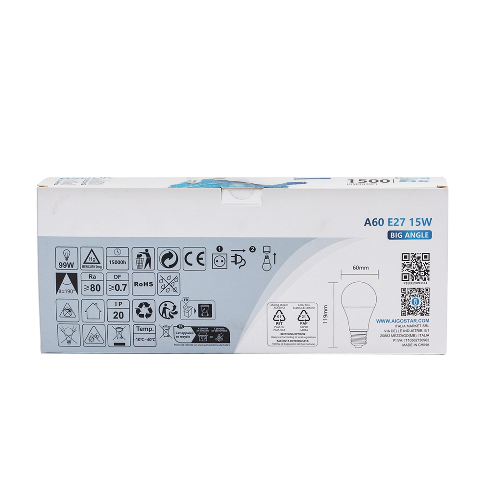 Confezione da 5 Lampadine Led E27 A60 15W Bianco freddo 6500K Aigostar