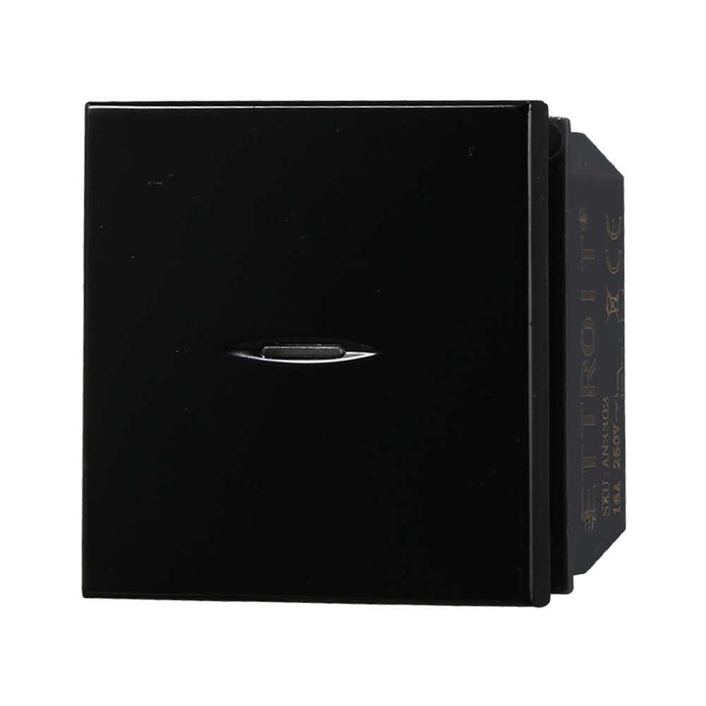 Il deviatore assiale 1 polo 2 moduli ad innesto 16A di colore nero con comando assiale e predisposizione per indicatore a luce led, serie moon della marca Ettroit, è compatibile con la serie civile BTicino Axolute.