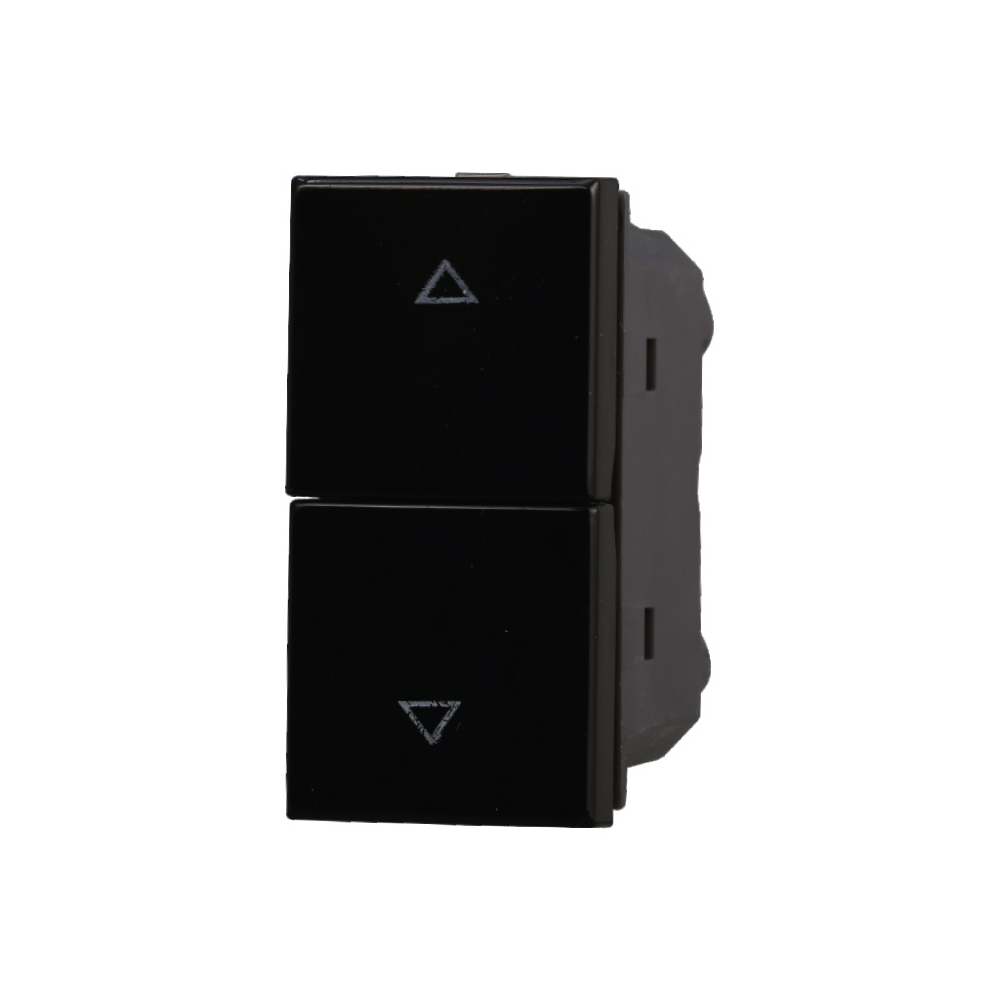 Il doppio pulsante con frecce (su e giù) 1 modulo ad innesto 10A di colore nero con comando per tapparelle, tende e serrande, serie moon della marca Ettroit, è compatibile con la serie civile BTicino Axolute.