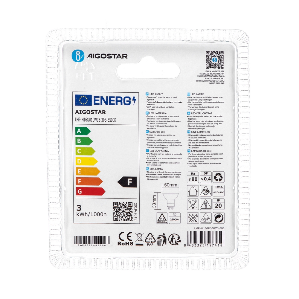 Faretto Led GU10 3W COB Apertura 38 gradi Bianco freddo 6500K Aigostar