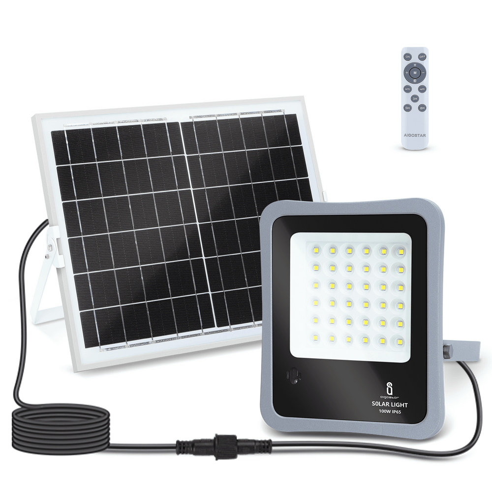 Faro Led 100W Grigio con pannello solare IP65 Bianco freddo 6500K Dimmerabile con telecomando e con sensore crepuscolare Aigostar