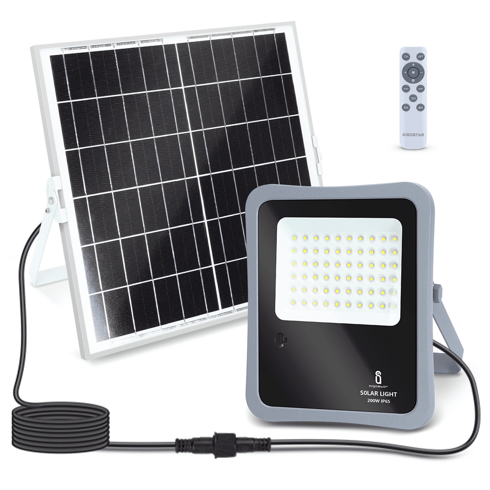 Faro Led 200W Grigio con pannello solare IP65 Bianco freddo 6500K Dimmerabile con telecomando e con sensore crepuscolare Aigostar