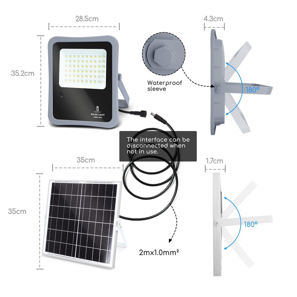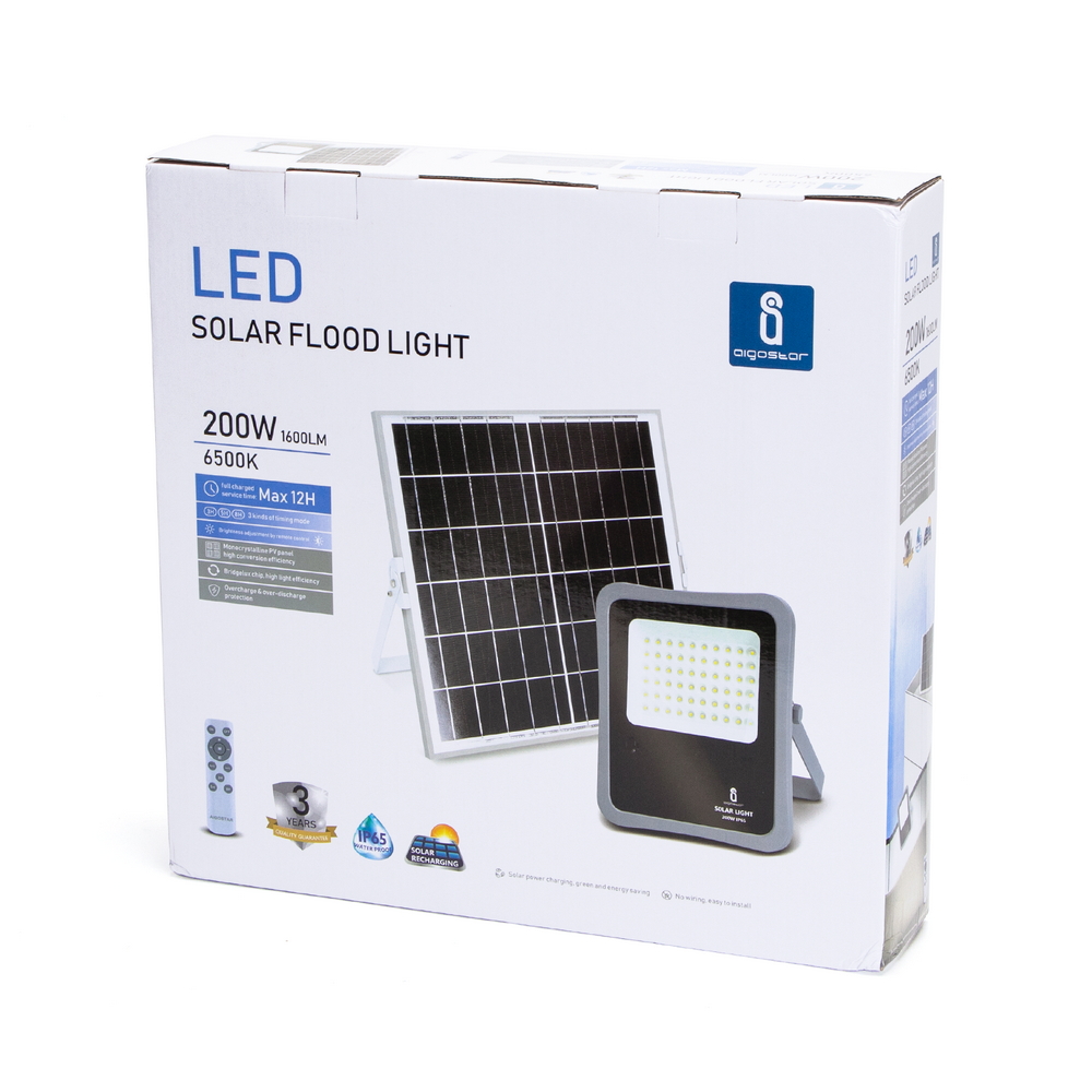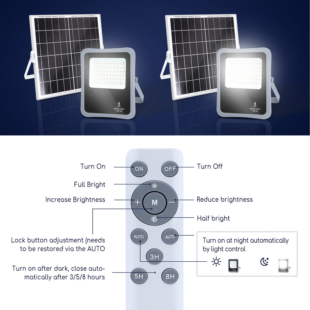 Il faro, di colore grigio e nero, emette un fascio di luce fredda dalla potenza di 200W, il che garantisce il massimo dell’energia raggiungibile nella categoria. È alimentato ad energia solare grazie al pannello solare (dimensioni 350x350x17 mm) che garantisce una durata di circa 12 ore. Nella confezione è anche incluso il telecomando per accedere/spegnere il faro e impostare la durata dell’accensione a 3-5-8 ore. Puoi anche regolarne la luminosità secondo le tue esigenze o il momento della giornata.