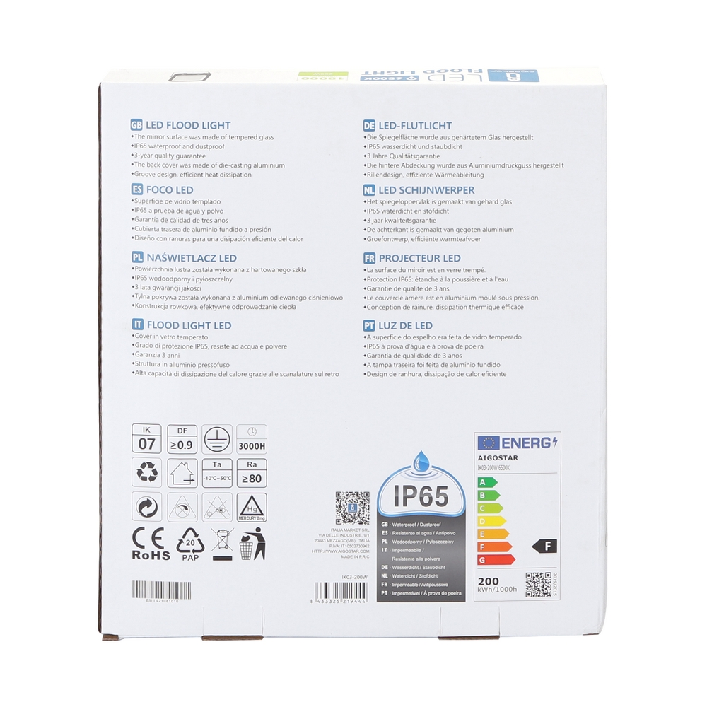 Faro proiettore Led 200W Nero da esterno IP65 Bianco freddo 6500K Aigostar
