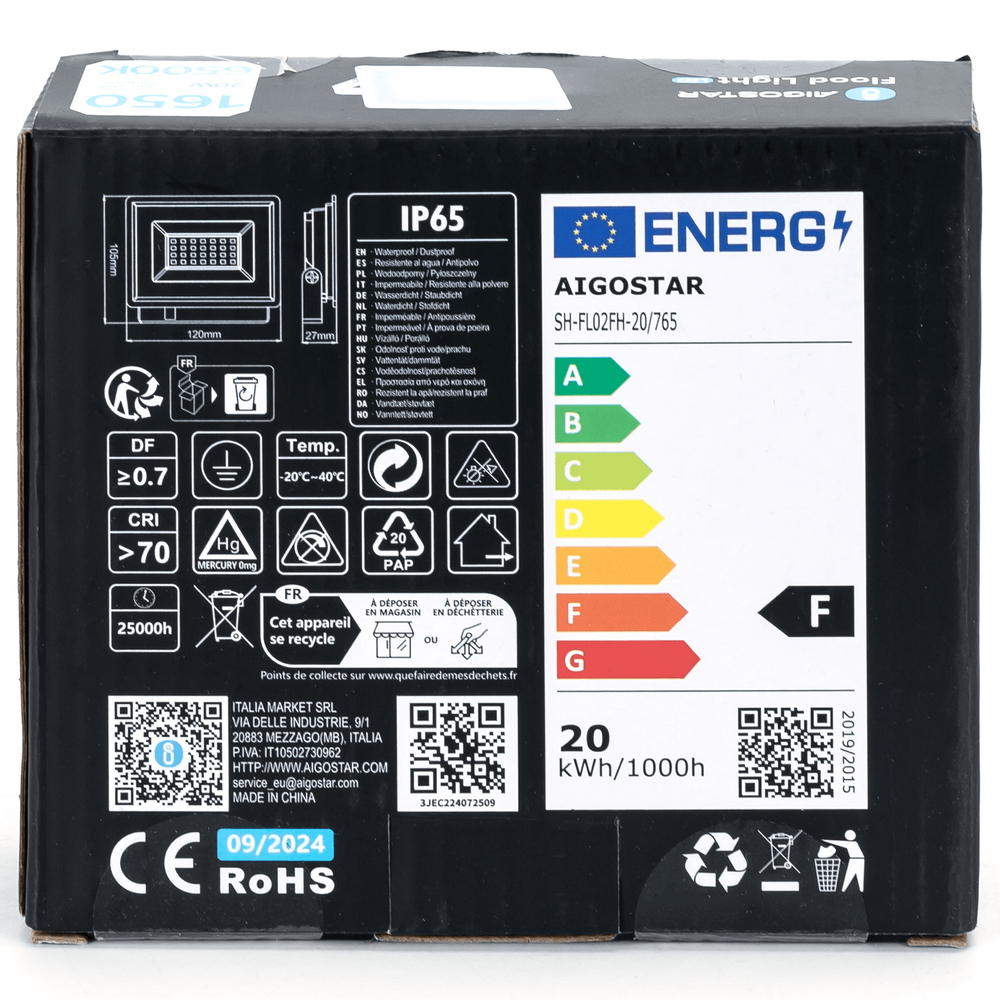 Faro proiettore Led 20W Bianco da esterno slim IP65 Bianco freddo 6500K Aigostar