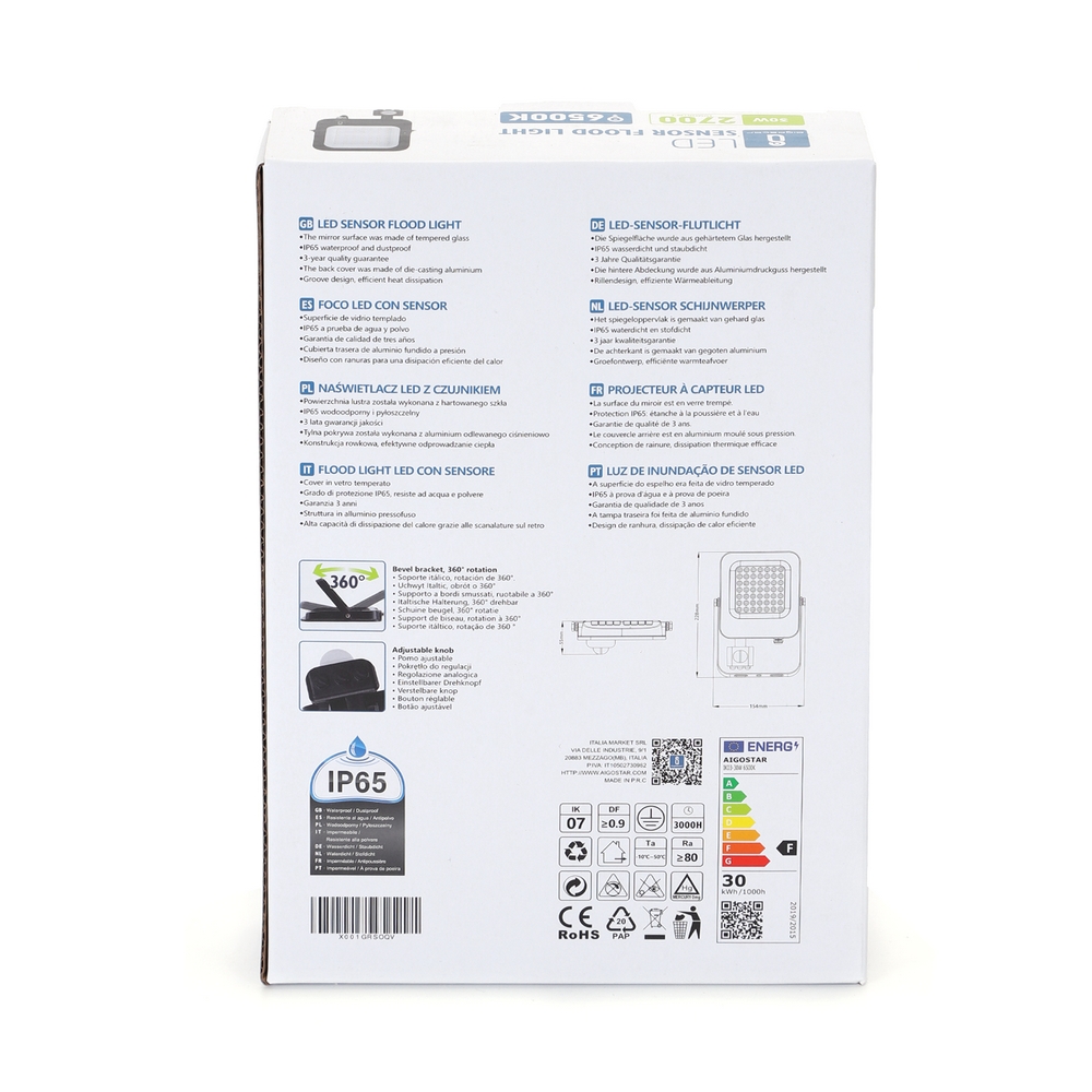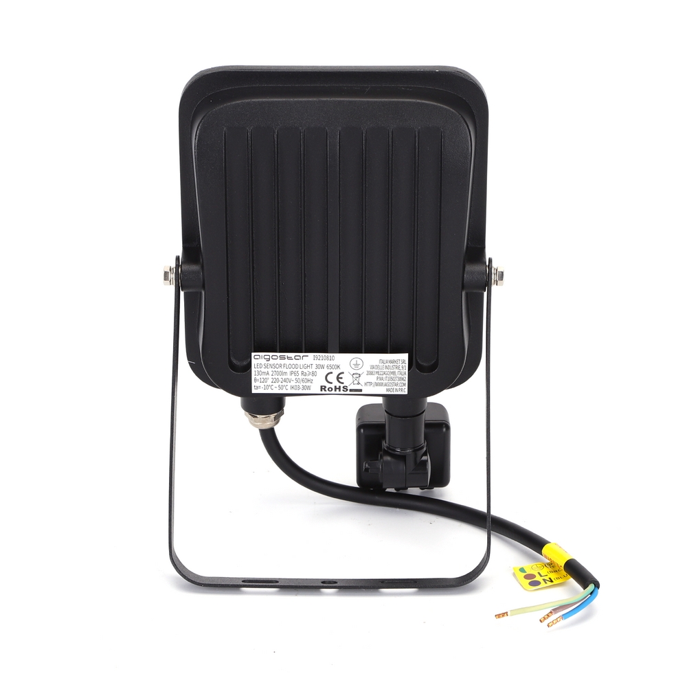 Faro proiettore Led 30W Nero da esterno IP65 Bianco freddo 6500K con sensore crepuscolare e di movimento Aigostar