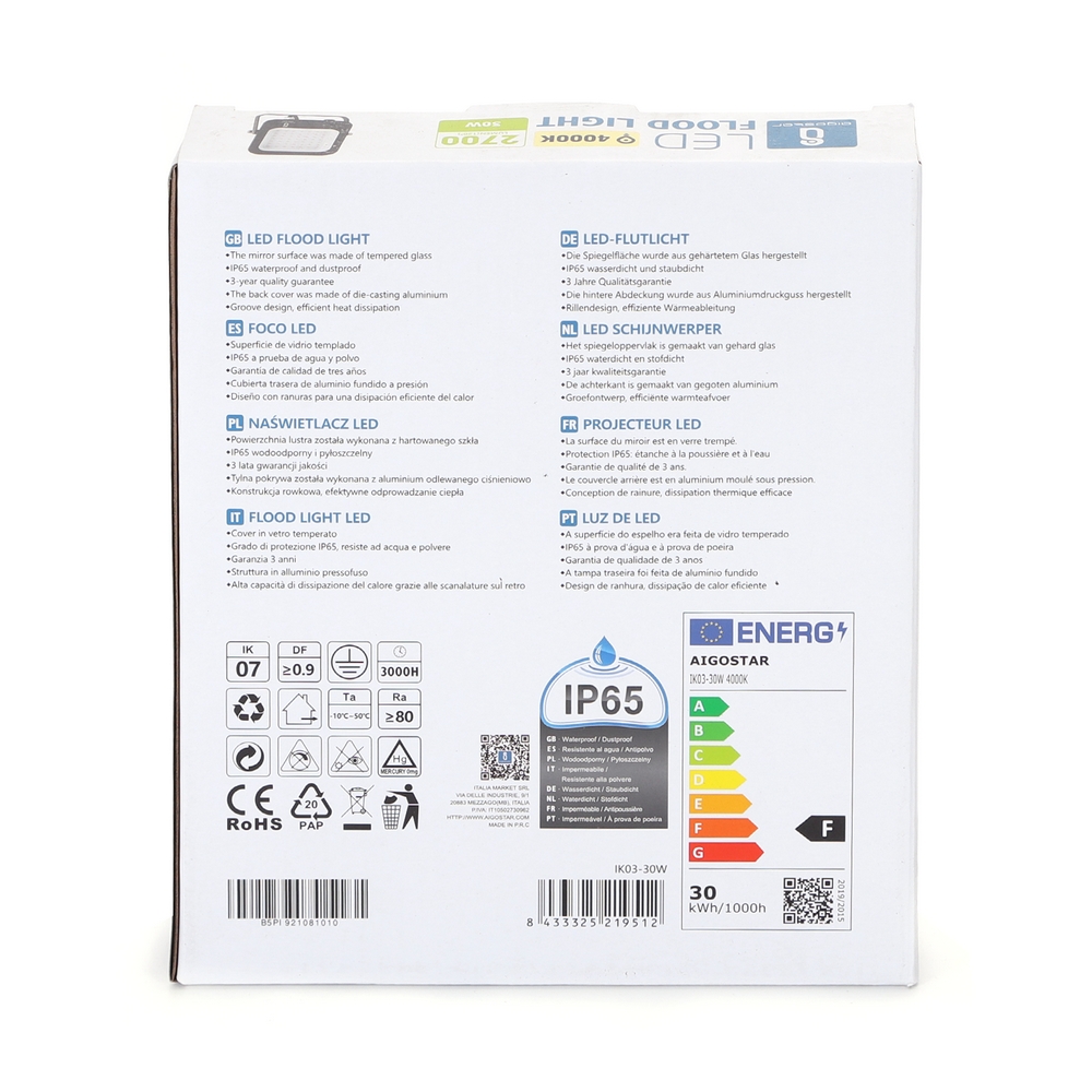 Il faro emette un fascio di luce neutra dalla potenza di 30W, il che rappresenta la miglior soluzione per contenere i consumi e non intaccare le prestazioni. Questo modello, costruito in alluminio e vetro temperato di colore nero, può essere utilizzato all’esterno perché protetto totalmente dalle polveri e dai getti d’acqua, oltre ad avere un grado di resistenza agli urti pari a IK07. Il faretto ha un’alta capacità di dissipazione del calore mediante le scanalature sul retro del prodotto.