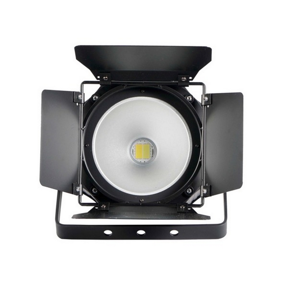 Faro teatrale PC con Led COB da 200W, equivalente ad un faro ad incandescenza di circa 2000W, controllabile tramite DMX (IN e OUT) e in manuale, alimentazione Powercon (IN e OUT), predisposto per il collegamento con gancio ad americana, orientabile, utilizzabile sia in situazioni professionali che amatoriali. Il faro è concepito per essere rivolto verso il palco e illuminare gli artisti, ma nulla vieta di utilizzarlo per qualsiasi altro scopo, è dotato di alette per direzionare la luce in un punto preciso del palco. Il faro emette sia luce calda (3200K), come un classico faro ad incandescenza, che fredda (6000k), inoltre si possono miscelare le due tipologie per ottenere una via di mezzo. I Led con tecnologia COB (Chip On Board), permettono una diffusione della luce omogenea e di qualità, evitando fastidiose irregolarità nell’illuminazione degli oggetti o delle persone. I collegamenti Powercon per l’alimentazione permettono di avere un collegamento sicuro per merito del blocco e l’acquisto di un cavo delle dimensioni desiderate, in modo da personalizzare il proprio cablaggio sull’americana o sul palco. Il faro può essere controllato da un mixer luci tramite collegamento DMX o in manuale tramite il pannello presente a bordo del dispositivo.