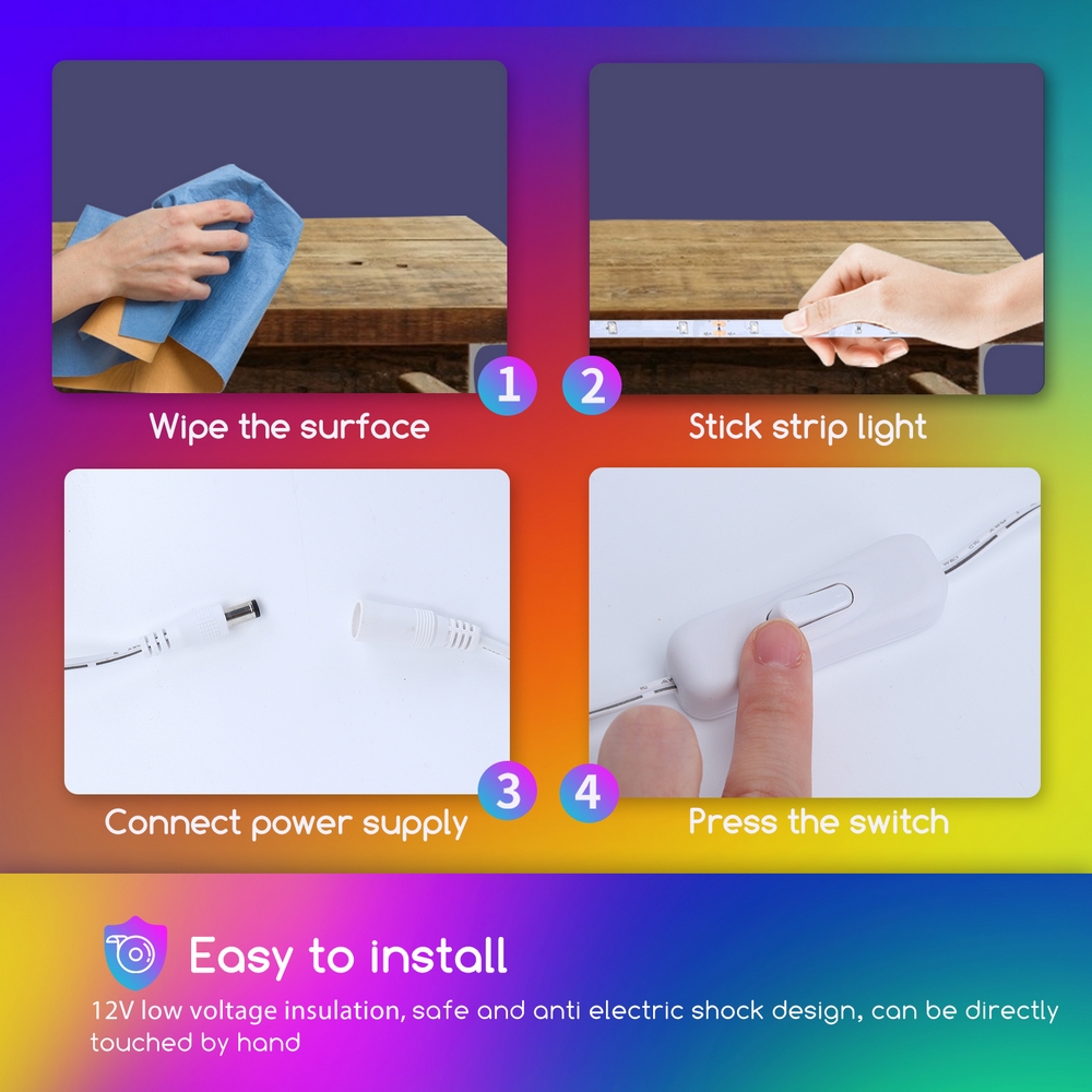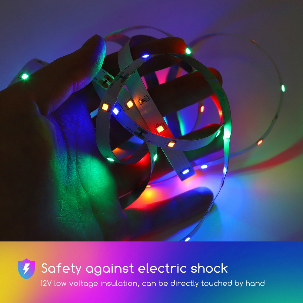 La striscia LED da 12V emette luce colorata dalla potenza di 5,5W, il che rappresenta la miglior soluzione per contenere i consumi e non intaccare le prestazioni. La striscia dispone di quattro colori – rosso, verde, blu, giallo (RGBY) – che si accendono contemporaneamente creando un effetto arcobaleno a luce fissa. Questo modello è avvolto in una bobina da 3 metri ed è possibile tagliare la striscia ogni 5 cm in modo da ottenere la lunghezza desiderata. Inoltre, è molto facile da installare grazie al pratico adesivo 3M che si fissa su tutte le superfici. Puoi anche regolarne la luminosità secondo le tue esigenze. È adatta per spazi interni ed esterni riparati. Nella confezione, oltre alla striscia LED, è incluso anche un trasfomatore, un adesivo e due staffe per il fissaggio.