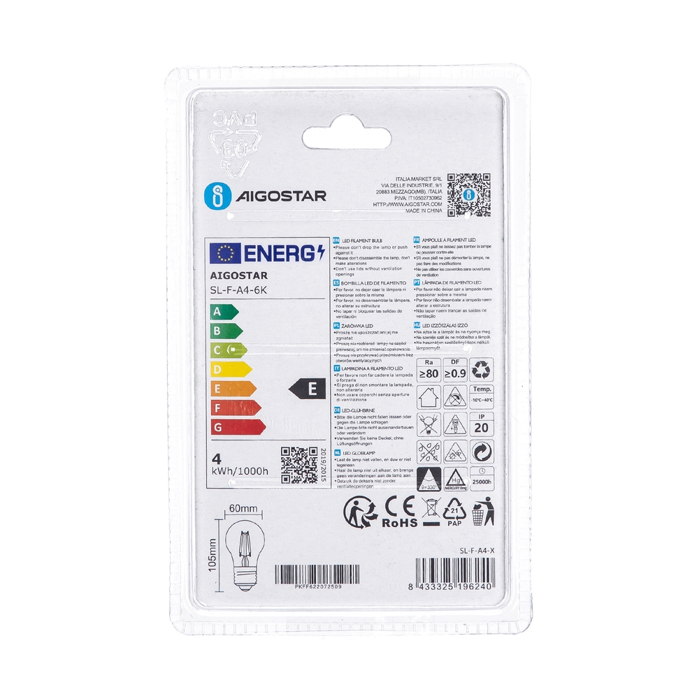 Lampadina Led a Filamento E27 A60 a bulbo 4W Bianco freddo 6500K Aigostar