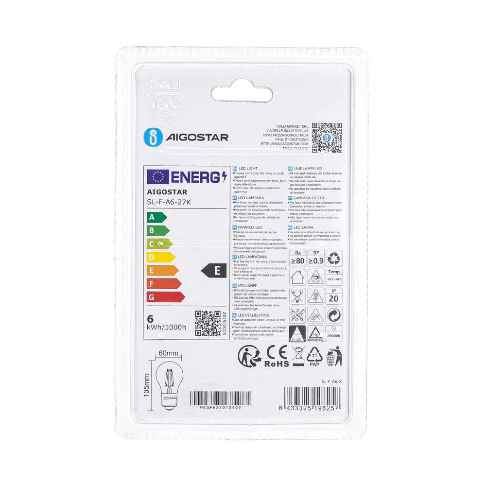 Lampadina Led a Filamento E27 A60 a bulbo 6W Bianco caldo 2700K Aigostar