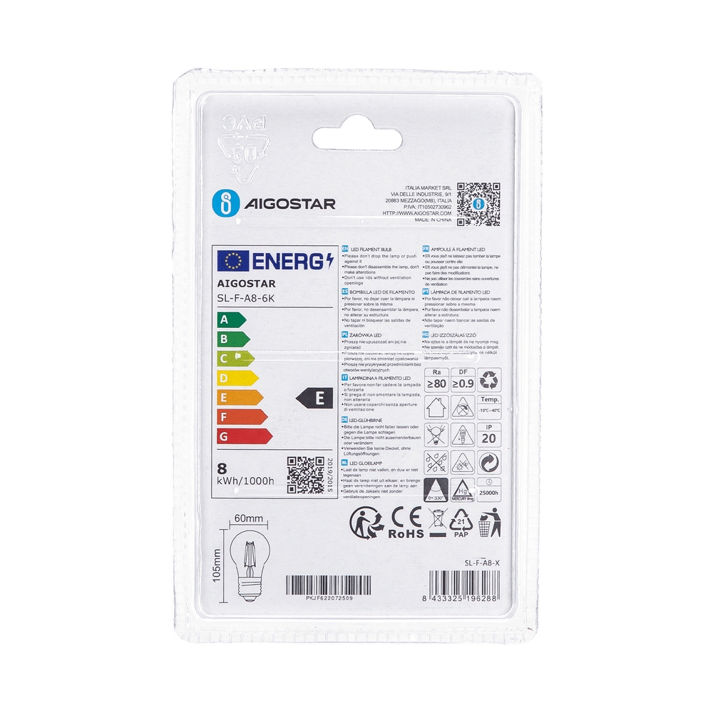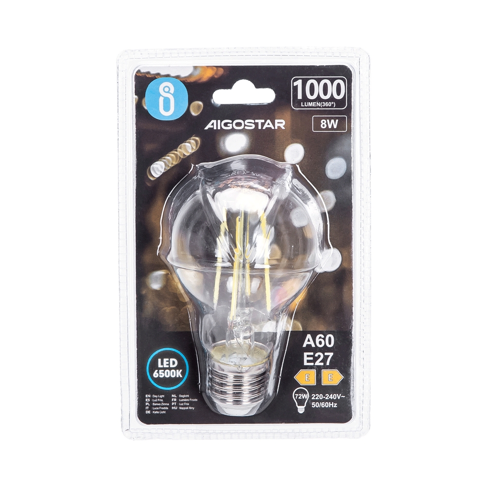 Lampadina Led a Filamento E27 A60 a bulbo 8W Bianco freddo 6500K Aigostar