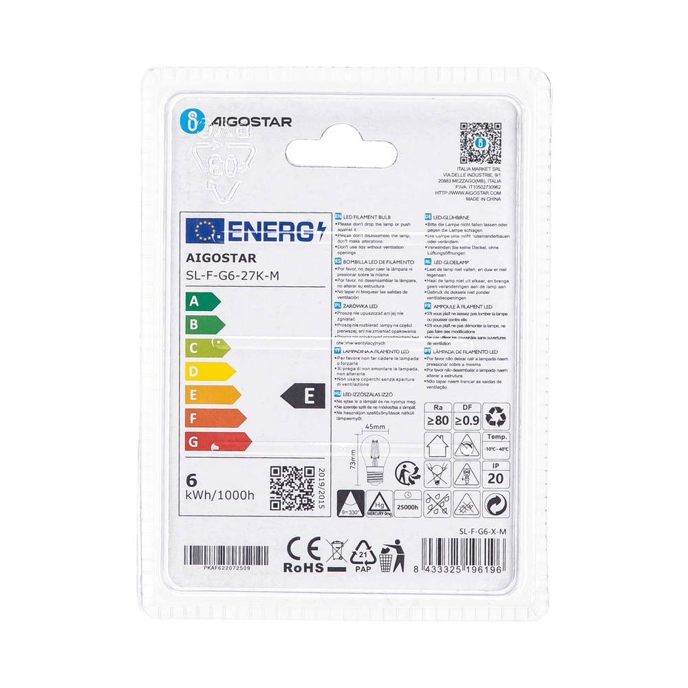 Lampadina Led a Filamento E27 G45 a sfera 6W Bianco caldo 2700K Aigostar