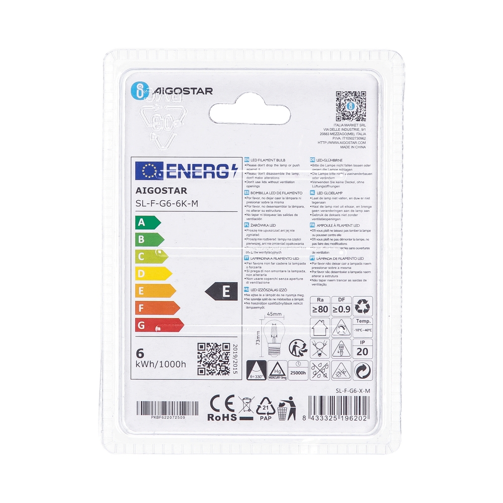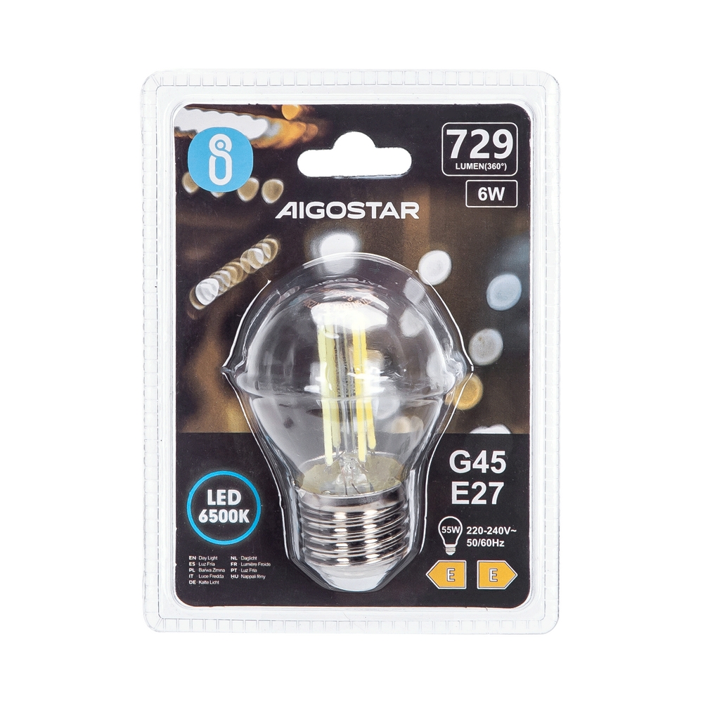 Lampadina Led a Filamento E27 G45 a sfera 6W Bianco freddo 6500K Aigostar