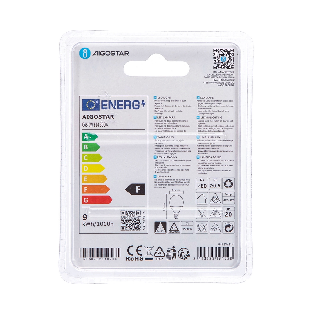 Lampadina Led E14 G45 a sfera 9W Bianco caldo 3000K Aigostar