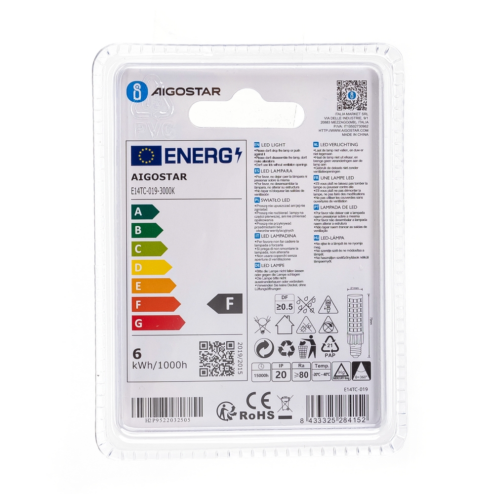 Lampadina Led E14 T22 6W Bianco caldo 3000K Aigostar