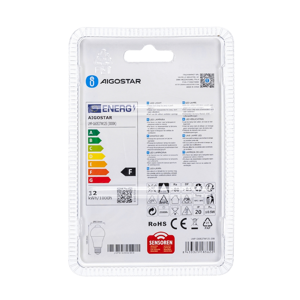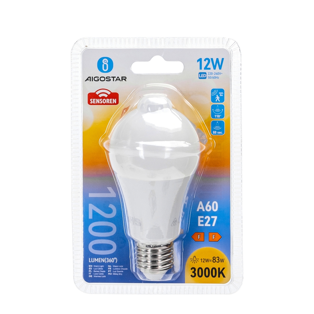 Lampadina Led E27 A60 a bulbo 12W Bianco caldo 3000K con sensore di movimento Aigostar