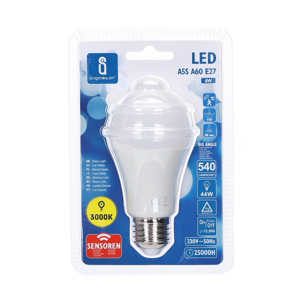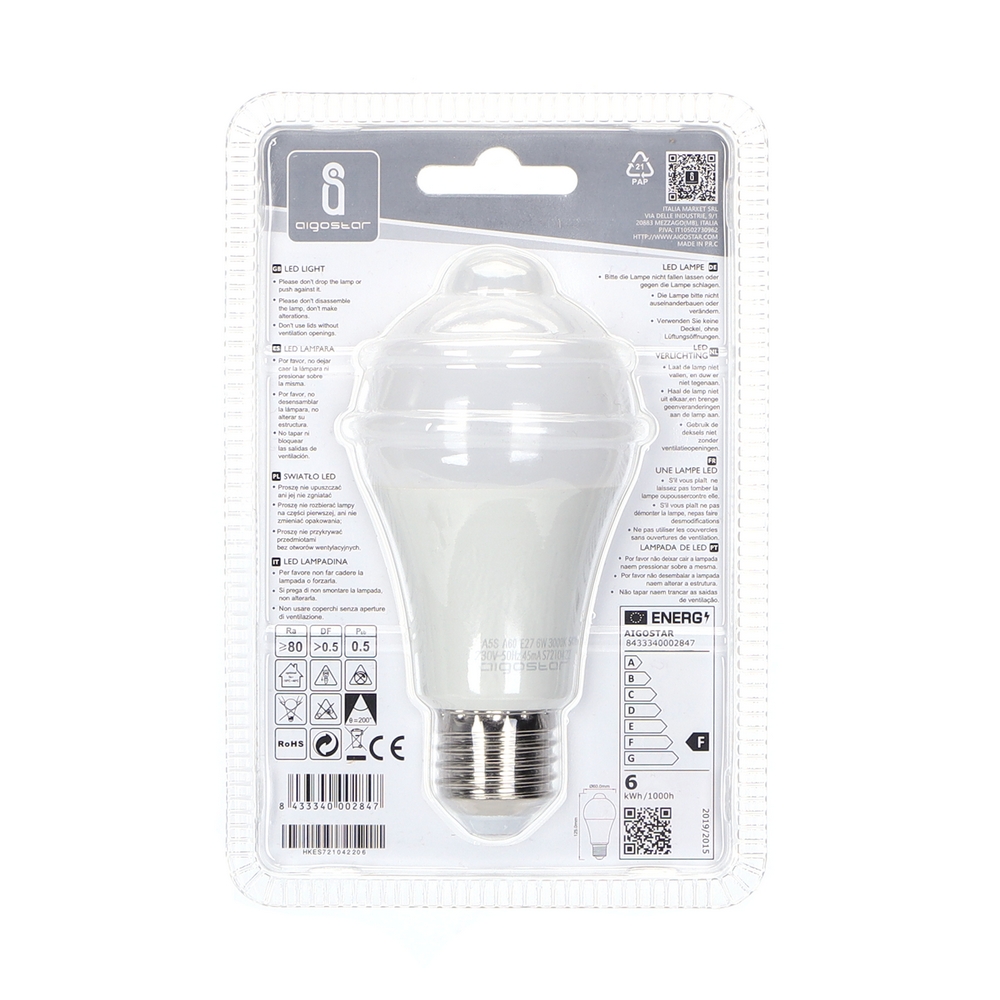Lampadina Led E27 A60 a bulbo 6W Bianco caldo 3000K con sensore di movimento Aigostar