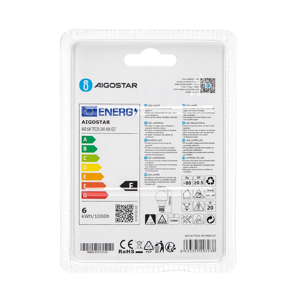 Lampadina Led E27 A60 a bulbo 6W Bianco neutro 4000K Aigostar