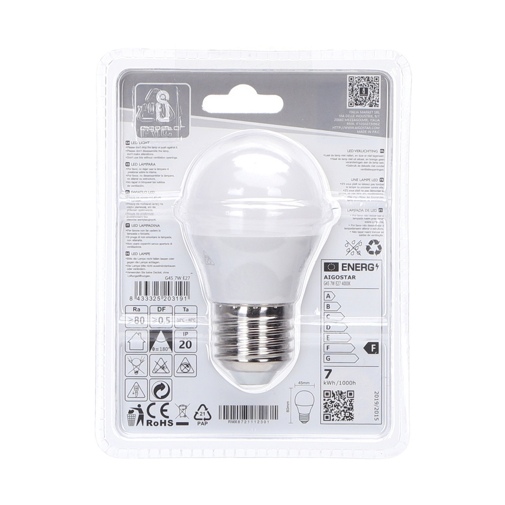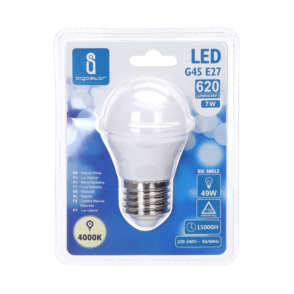 Lampadina Led E27 G45 a sfera 7W Bianco neutro 4000K Aigostar