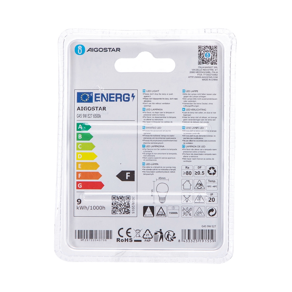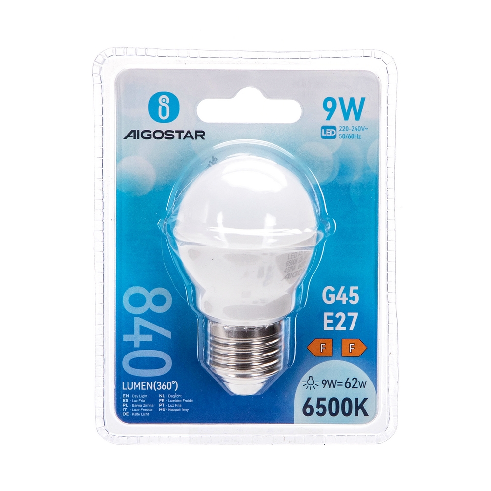 Lampadina Led E27 G45 a sfera 9W Bianco freddo 6400K Aigostar