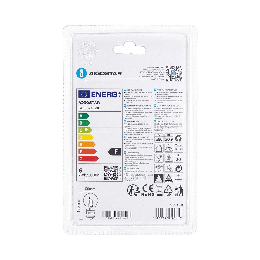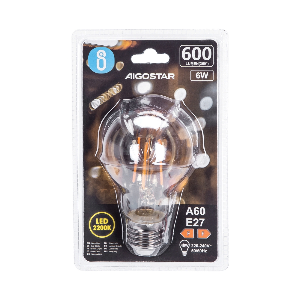 Lampadina Led Vintage a Filamento E27 A60 a bulbo 6W Bianco caldo 2200K Aigostar