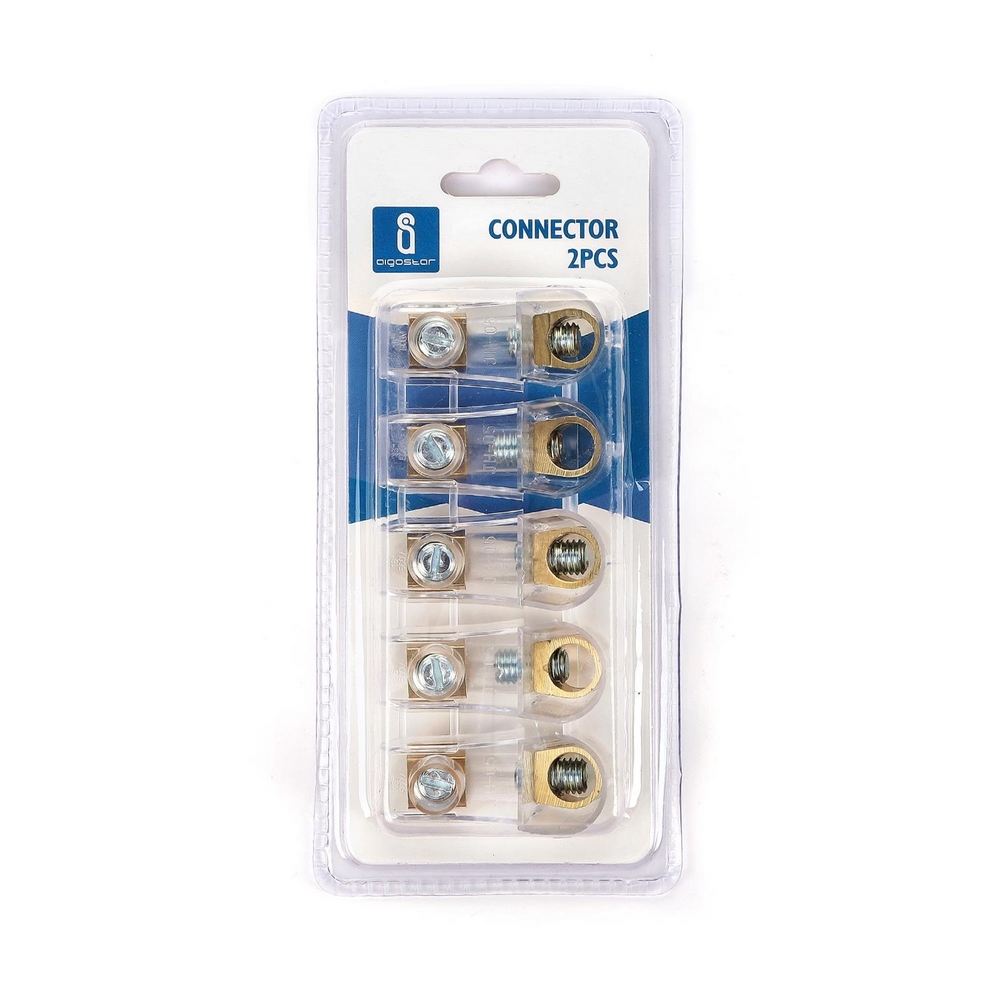 La confezione contiene 2 strisce da 5 pezzi ossia 10 morsetti terminali a vite elettrici di tipo a cappuccio unipolare da 16 mm per cavi da 16 mm². I morsetti hanno un involucro isolante in PC trasparente e corpo in ottone.