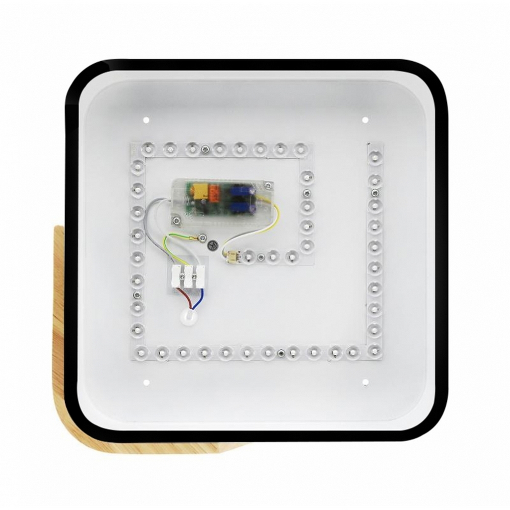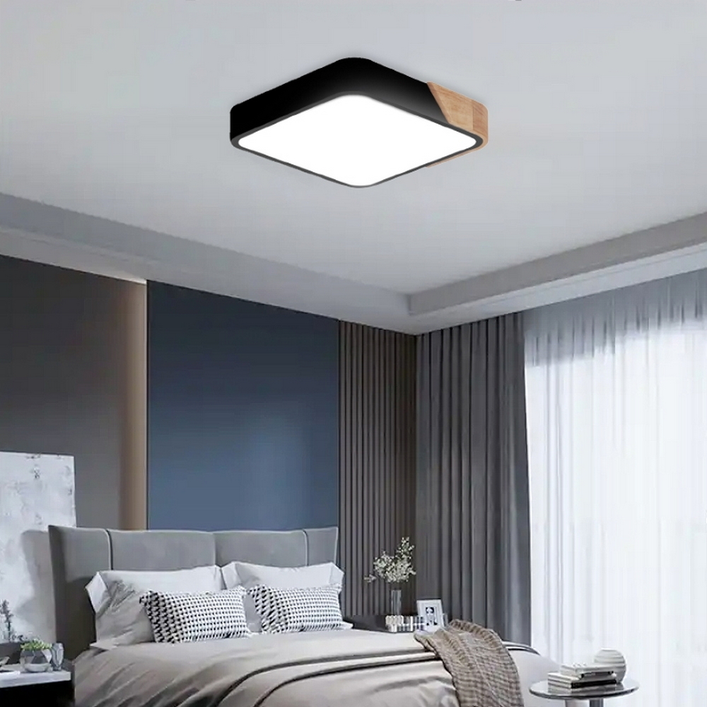 Il design squadrato con angoli arrotondati e la combinazione di nero e legno marrone aggiungono un tocco di eleganza e calore, facendo di questa plafoniera una scelta ideale sia per gli ambienti moderni che per quelli più tradizionali. È particolarmente adatta per spazi che beneficiano di un tocco organico per mitigare la freddezza di arredi minimalisti o moderni.