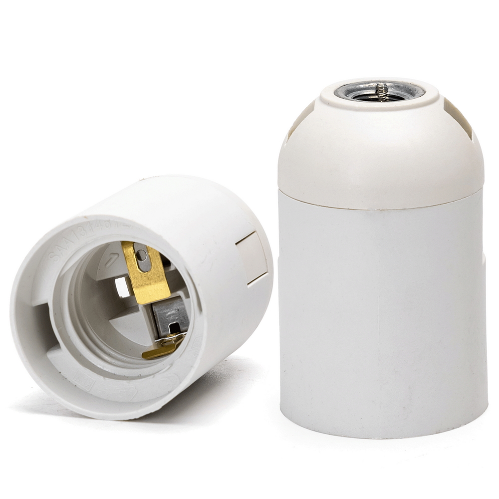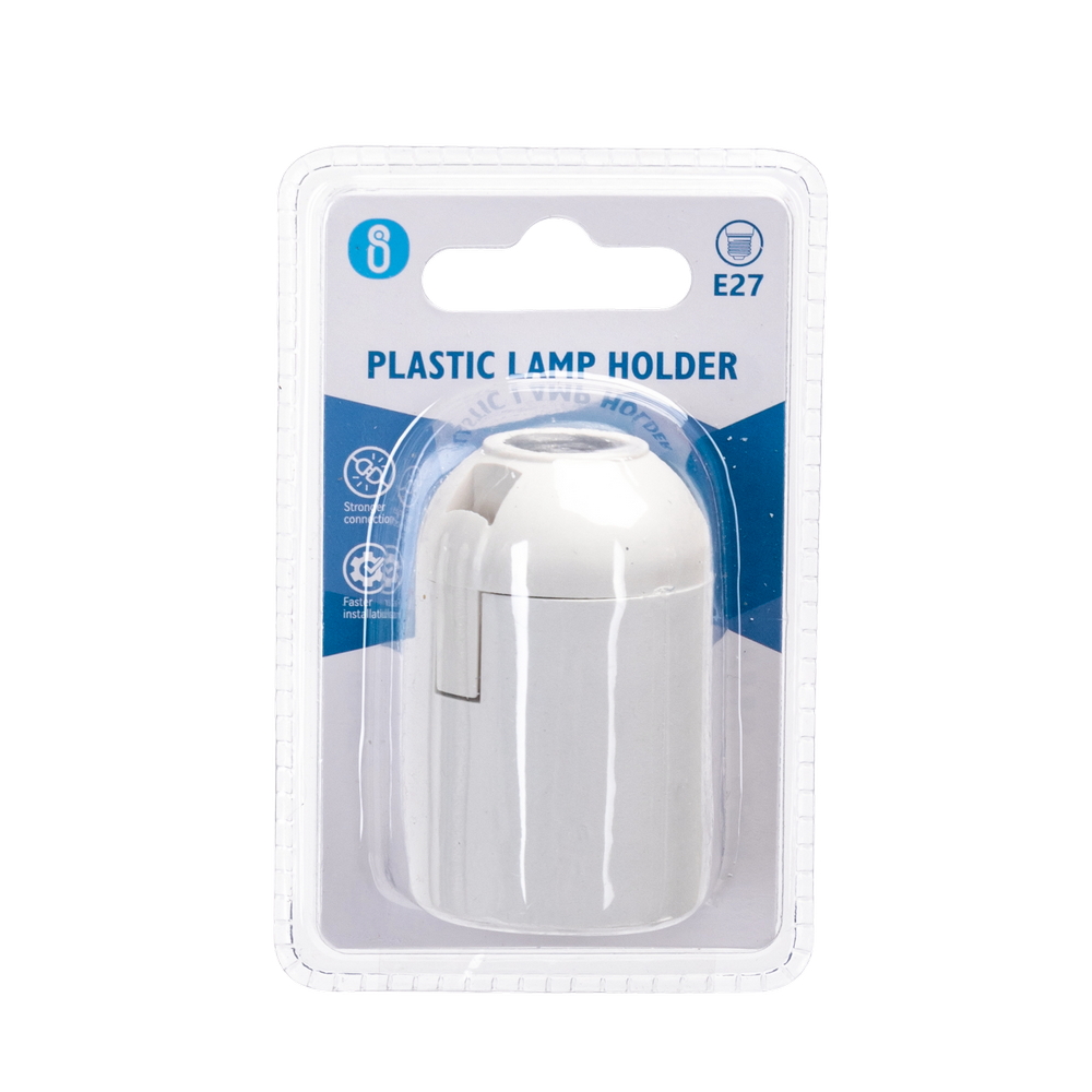 Portalampada con attacco E27 di colore bianco, realizzato in plastica resistente e isolante, ideale per un utilizzo sicuro e duraturo. La sua superficie liscia e il design essenziale lo rendono perfetto per installazioni discrete e pulite, sia in ambienti domestici che professionali.