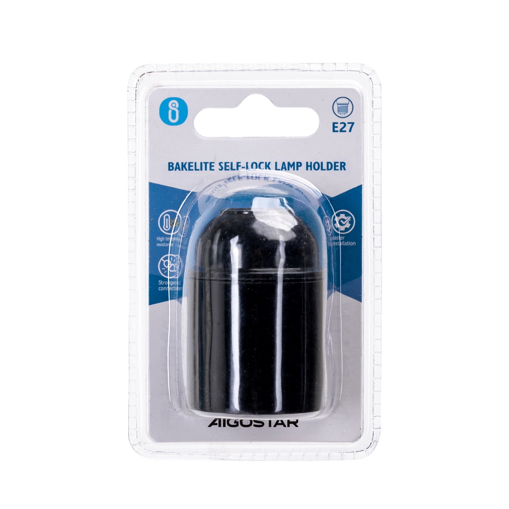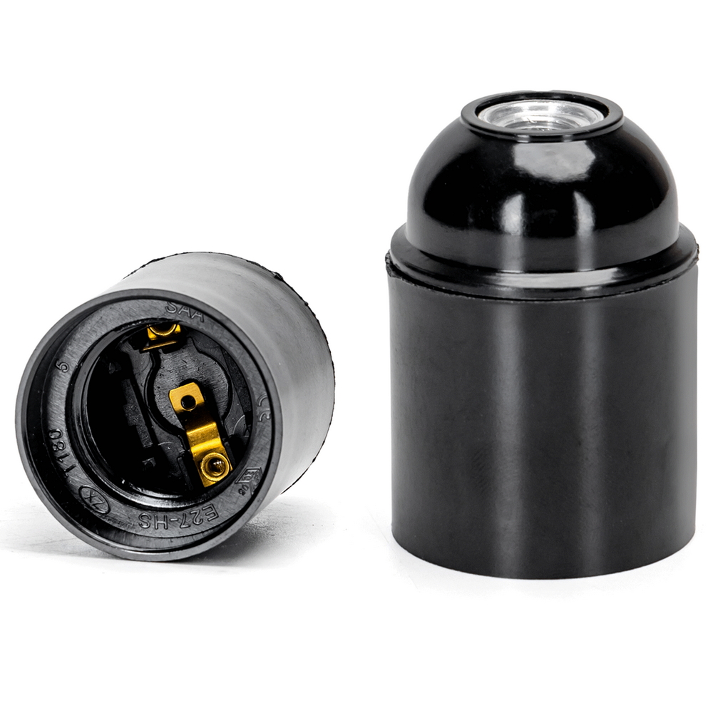 Portalampada per attacco E27 realizzato in resistente bachelite di colore nero, pensato per garantire sicurezza e durata nel tempo. Il suo design compatto e funzionale lo rende ideale per molteplici applicazioni domestiche o professionali, assicurando un montaggio pratico e stabile.