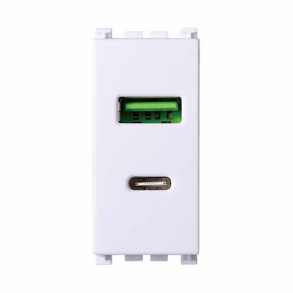 Il connettore USB e Type-C 1 modulo 2 posti ad innesto 5V 3.1A, di colore bianco, serie Venus della marca Ettroit, è compatibile con la serie civile Vimar Arké.