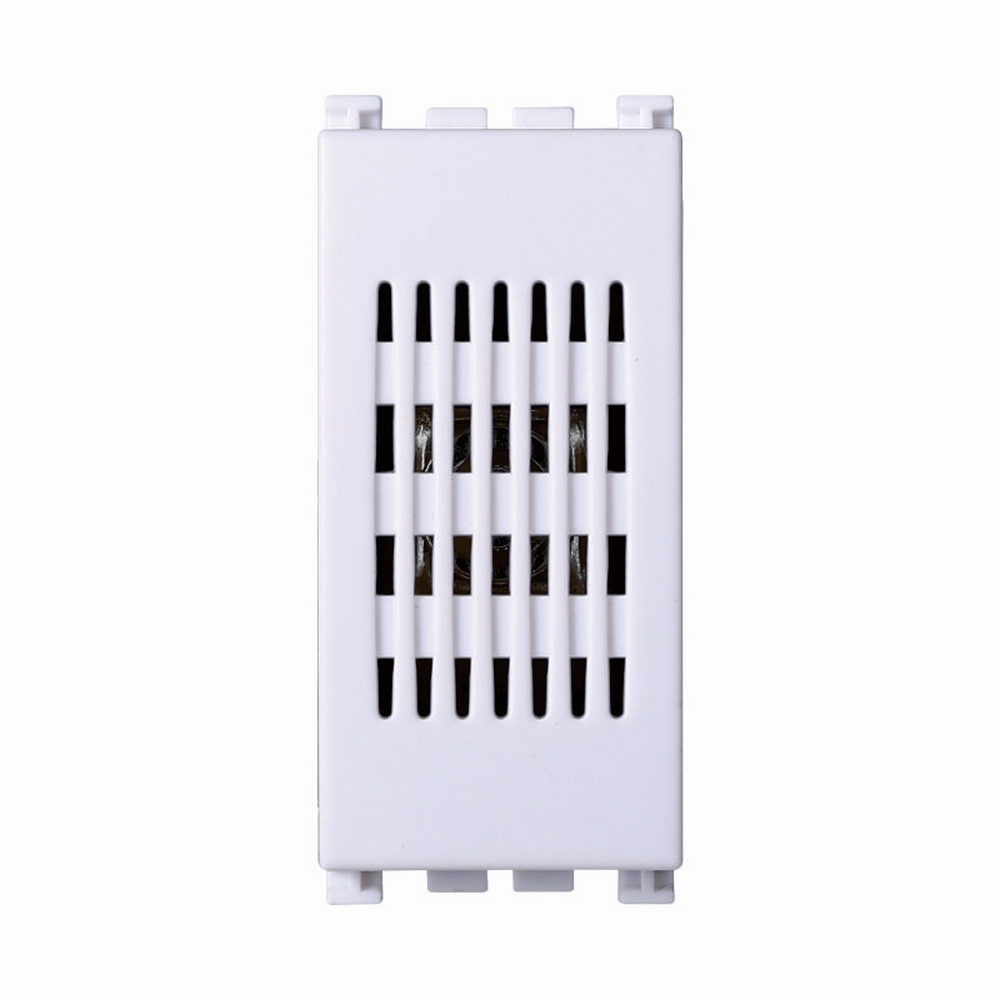 Il ronzatore per campanello elettrico da 230V, utilizzato per sentire il campanello in ambito domestico, ha 1 modulo ad innesto di colore bianco della serie Venus della marca Ettroit è compatibile con la serie civile Vimar Arké.