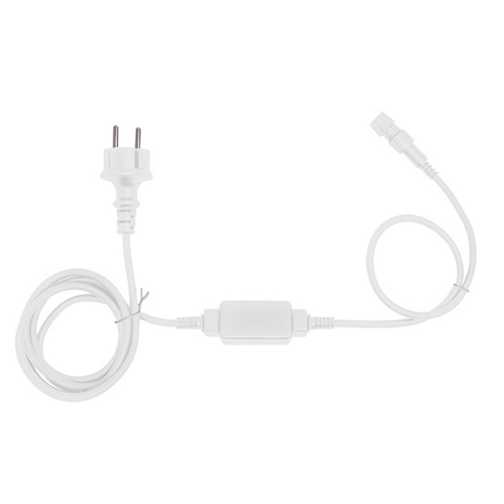 Spina di collegamento alla rete elettrica 220V-240V per collegare direttamente alla rete elettrica le prolunghe di Catene luminose Reflex professionali da 1,5 metri, 3 metri e 5 metri, filo di colore bianco, lunghezza 1,5 metri, IP44 adatta per uso esterno ed interno.