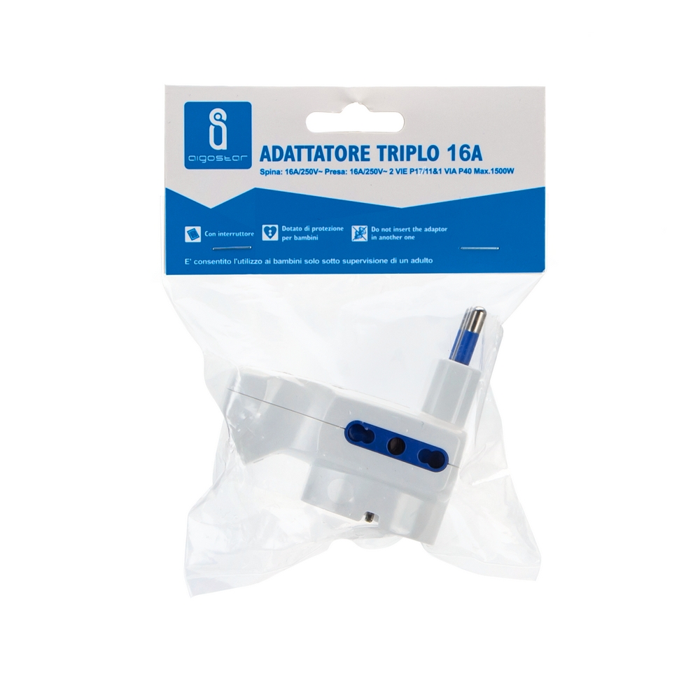 La spina tripla grande 16A di colore bianco è un adattatore con 2 prese bipasso e uuna presa schuko P17/11 dotato di interruttore. La spina è in grado di supportare una potenza massima di 1500W. Inoltre, ha anche la protezione per i bambini e certificazione CE.