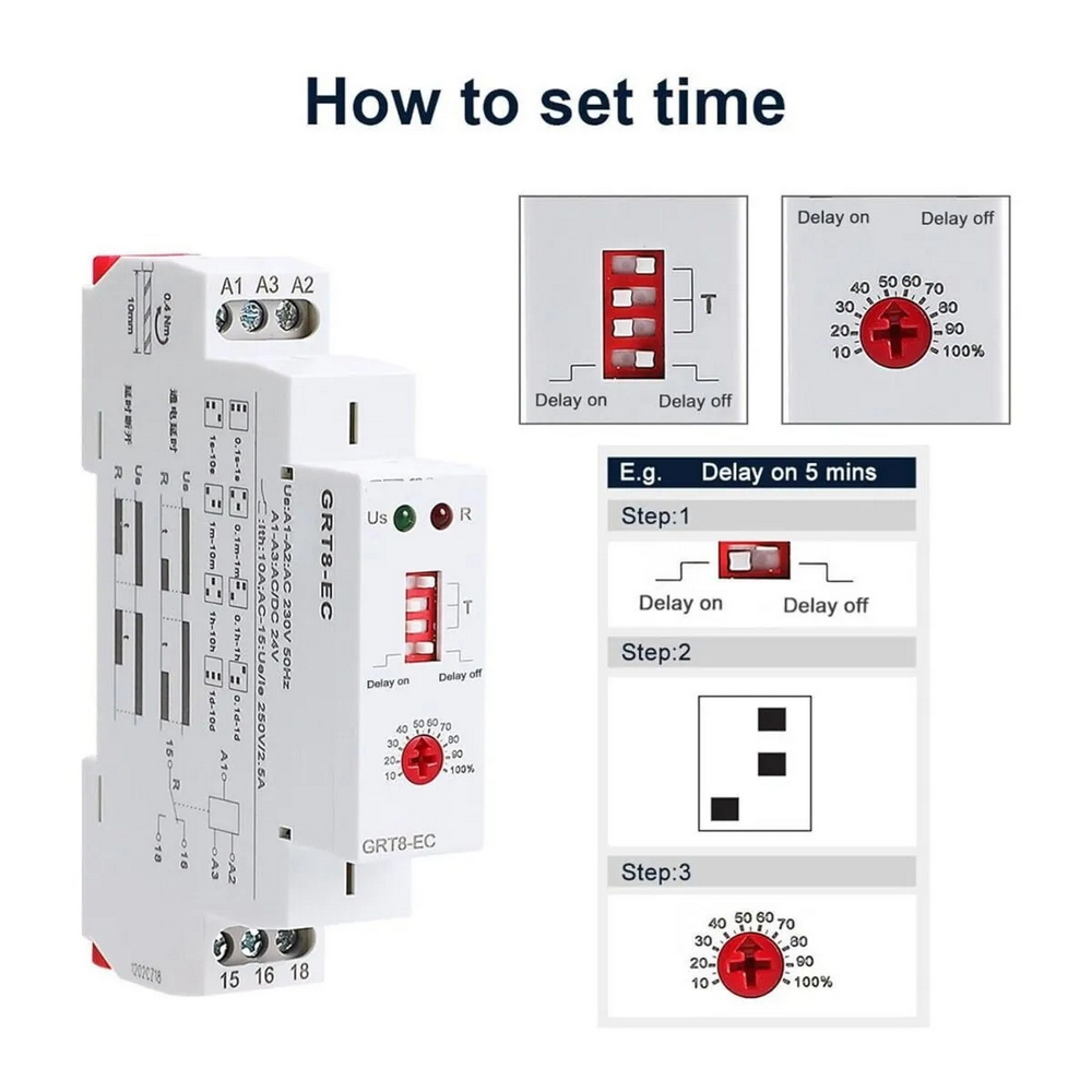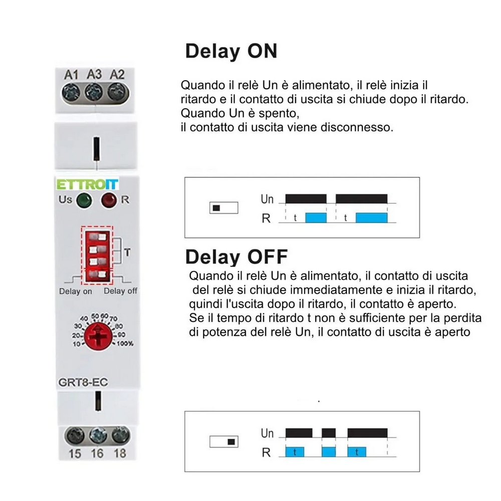 Il relé integra due modalità operative selezionabili: On Delay (ritardo all’accensione) e Off Delay (ritardo allo spegnimento). Questa doppia funzionalità lo rende estremamente versatile, ideale per la gestione temporizzata di pompe, motori, sistemi di ventilazione, riscaldamento, automazioni e impianti di illuminazione. La regolazione da 0,1 secondi fino a 10 giorni consente un controllo preciso e adattabile a qualsiasi esigenza.