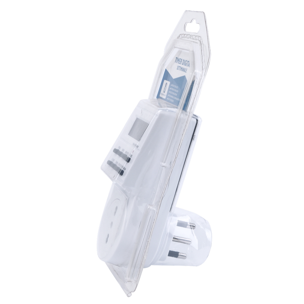Il display digitale chiaro e intuitivo facilita la configurazione delle impostazioni, rendendo il timer semplice da utilizzare anche per chi non ha esperienza. Il design compatto e il colore bianco neutro si integrano facilmente in qualsiasi ambiente, mantenendo un aspetto ordinato e discreto.