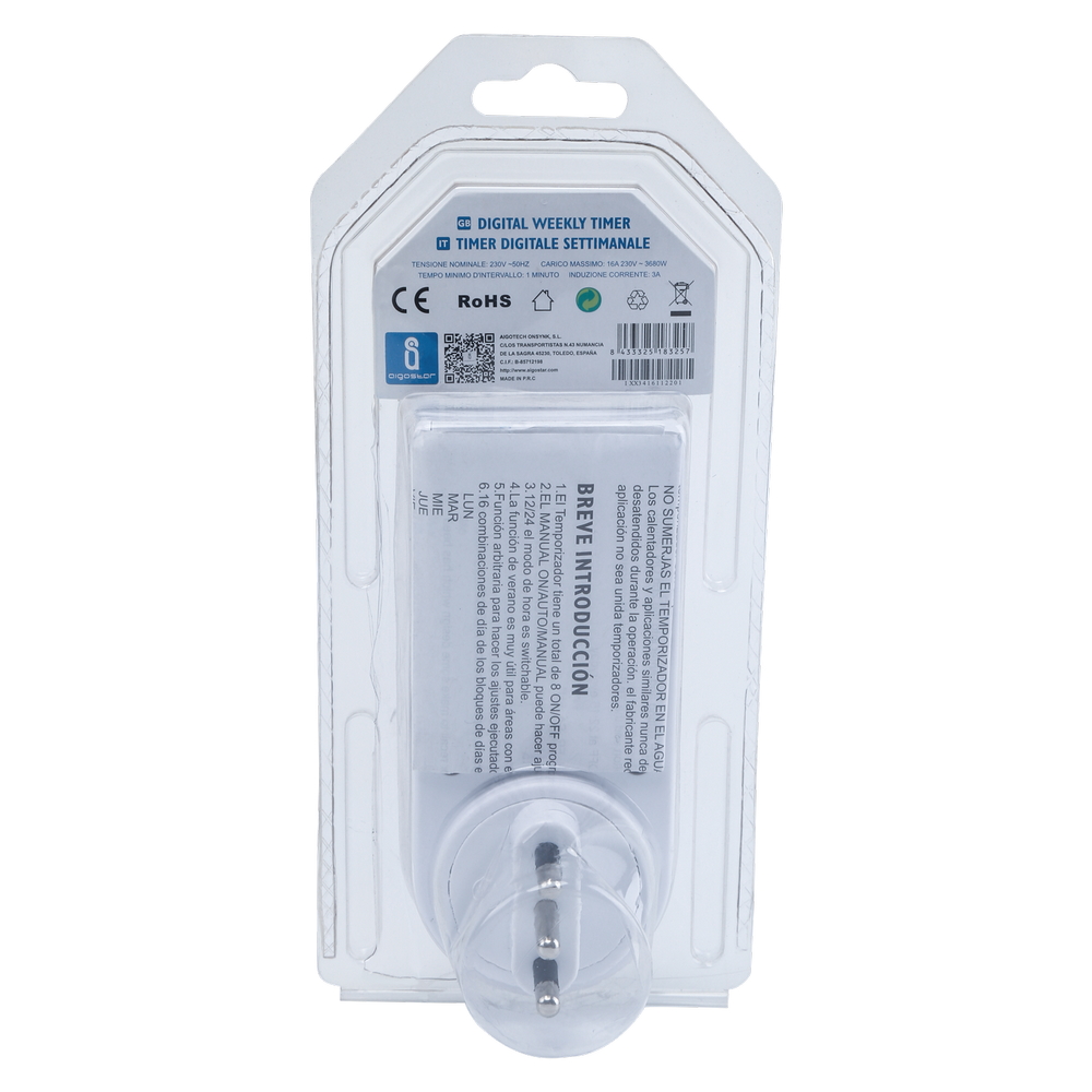 Supporta una potenza massima fino a 3680W con spina da 16A, risultando adatto al controllo di numerosi apparecchi come luci, elettrodomestici, riscaldatori, pompe, acquari, insegne luminose o dispositivi elettronici. La programmazione settimanale consente di impostare più cicli di accensione e spegnimento in base ai giorni della settimana, garantendo comfort e praticità senza interventi manuali.